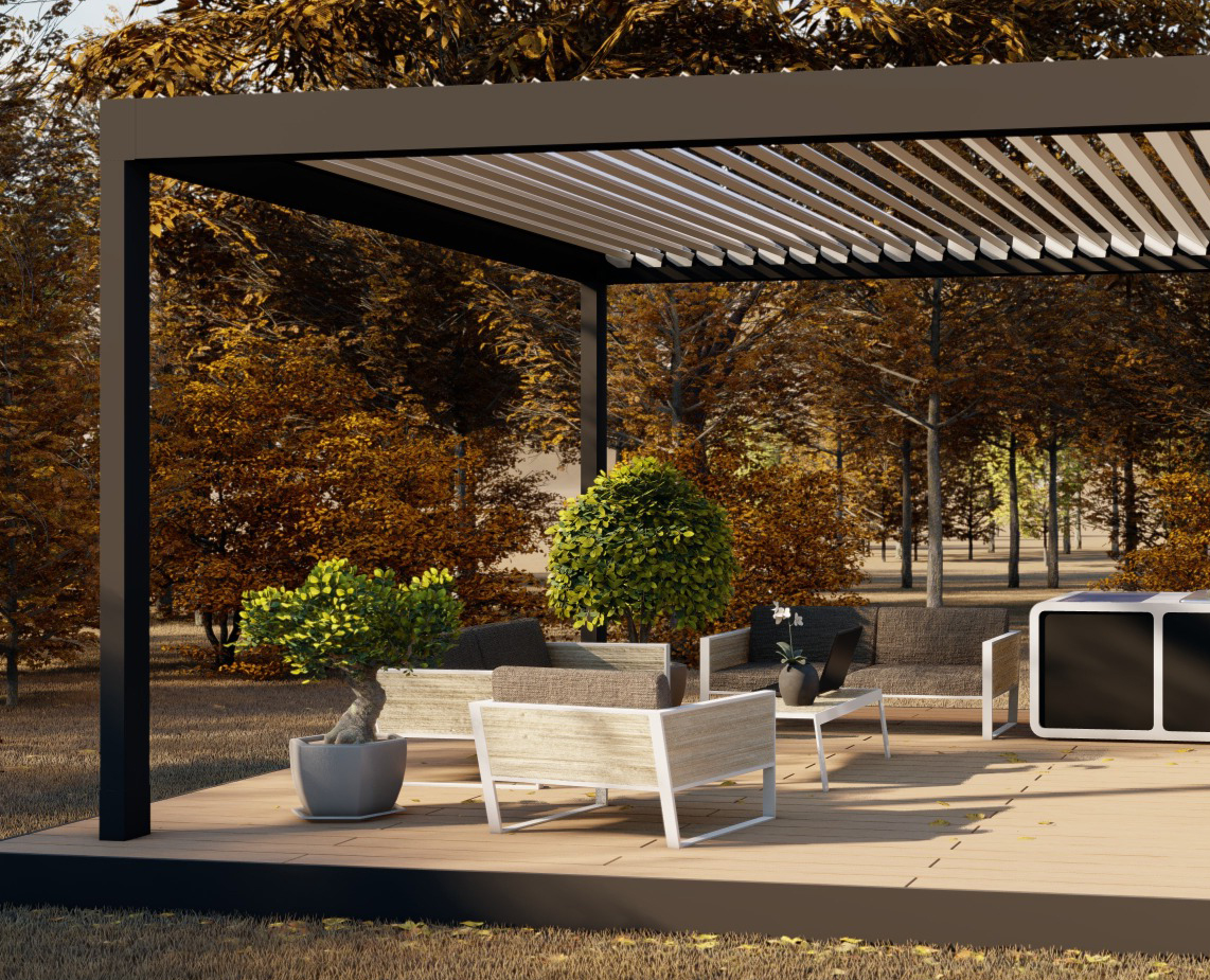 Stenungsund pergola med motordrivna lameller som ger dig solskydd under dagen och mysfaktor under stjärnorna på kvällen.